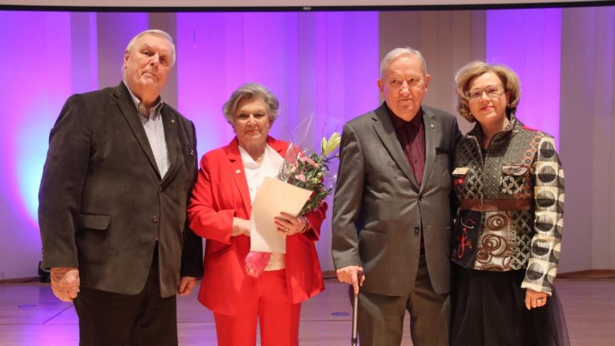 Tapahtumassa palkittiin myös Vuoden 2024 senioriyhdistys, Kotkan seniorit ry. Huomionosoituksen vastaanottivat yhdistyksen puheenjohtaja Mirja Baldauf-Pulkkinen ja kunniapuheenjohtaja Tauno Kankanen (kuvassa keskellä). Palkitsemishetkessä olivat mukana Kansallisen senioriliiton puheenjohtaja Kari Kantalainen (vasemmalla) ja toiminnanjohtaja Maarit Kuikka ( oikealla), jotka suorittivat palkitsemisen.